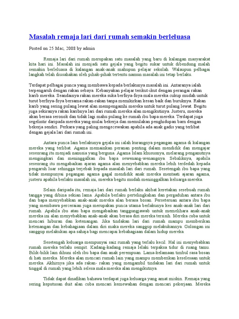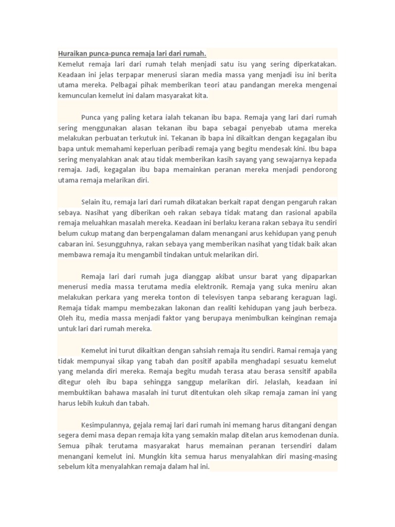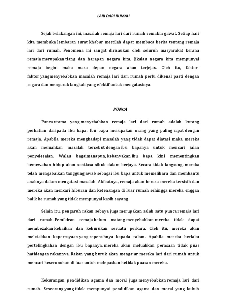 PENDAHULUAN Pelajar atau remaja merupakan pelapis yang bakal memimpin negara ini. Karangan lari dari rumah Masalah remaja lari dari rumah mendapat liputan meluas media massaHuraikan punca-punca remaja lari dari rumah. Seks rambangpergaulan bebasbohsiabohjan.